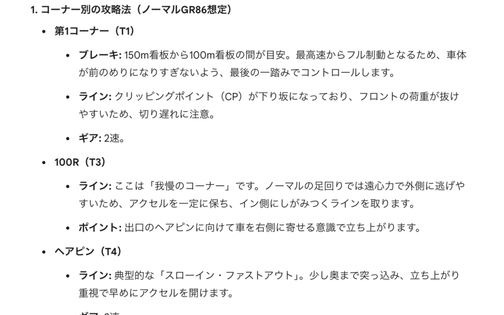実際のコース図を共有して、もう一度試みた。出力は明確に変わった。渡す前は「T1はヘビーブレーキングゾーンです」という水準の記述だった。渡した後は、ブレーキング開始の目安となる看板の位置、下り勾配のパーセンテージ、シフトダウンのパターン、リア荷重の変化まで、具体的な数字と理由が伴う説明になった。以下はセクター1のまとめだ