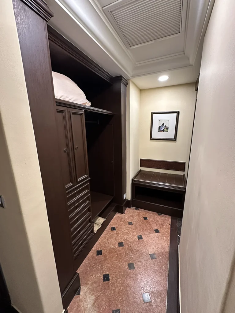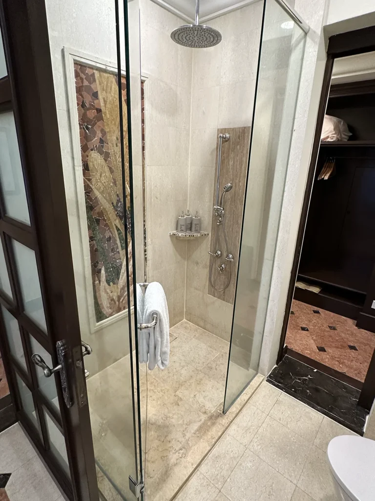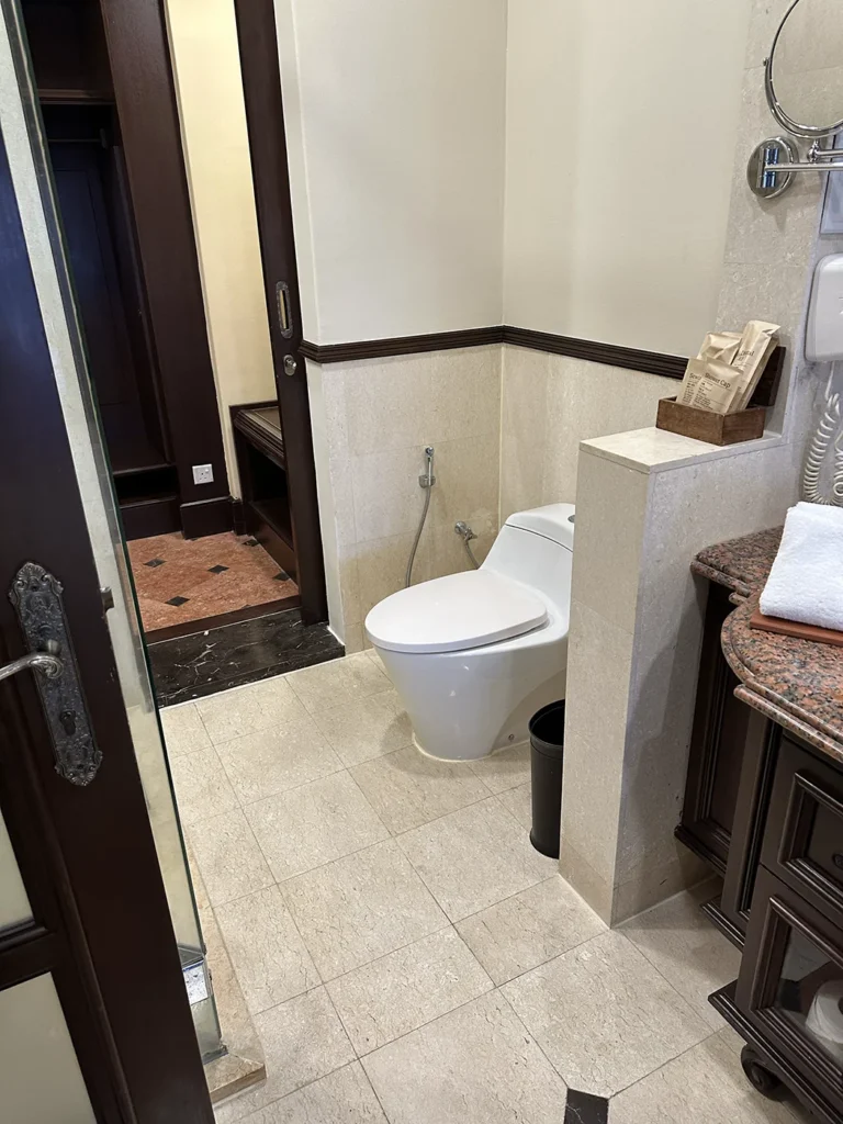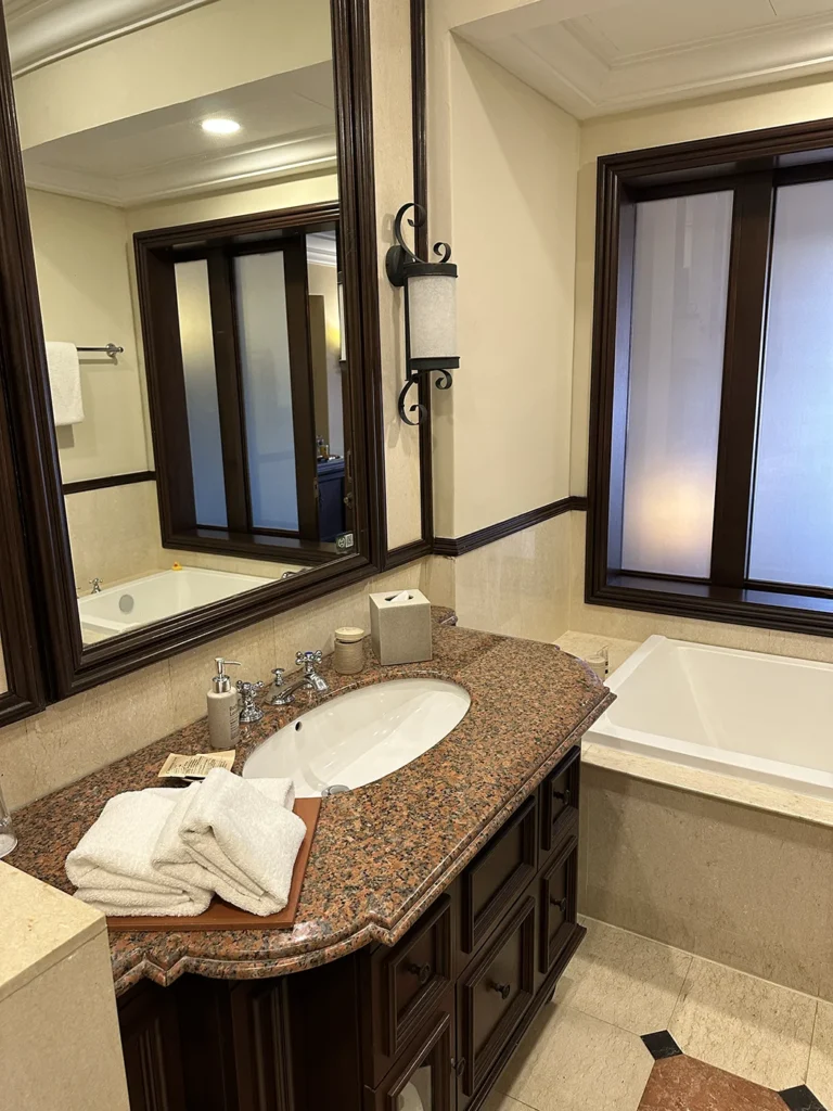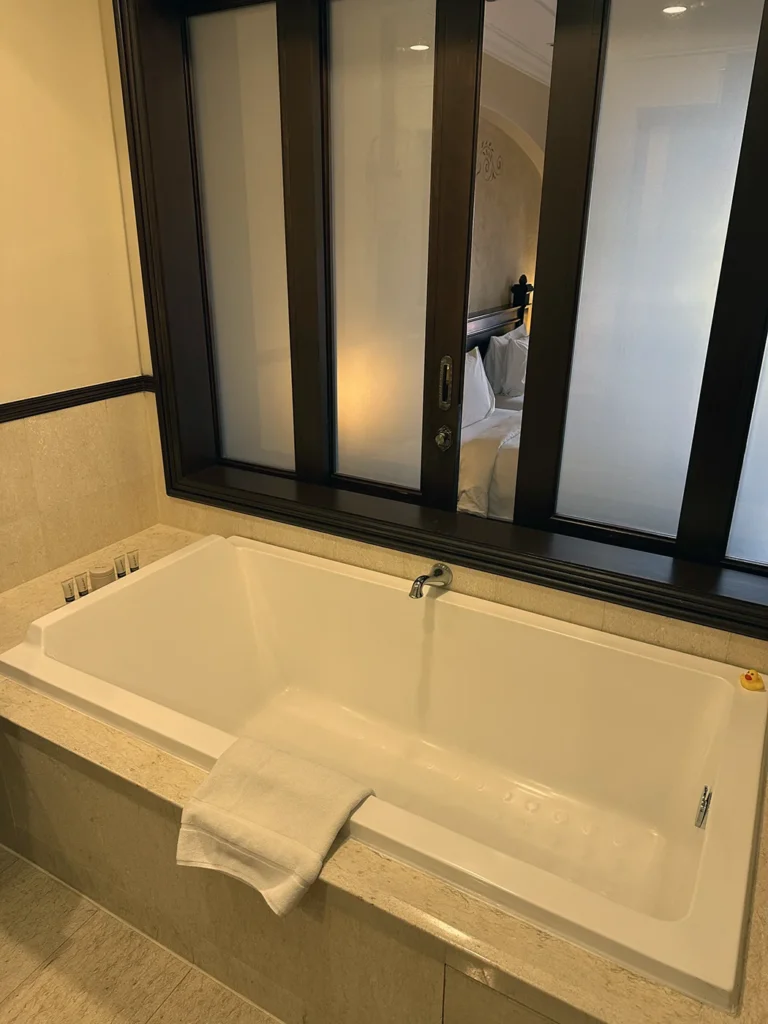 バスルームはクロークと部屋からアクセスができ、バスタブ、シャワーブース、洗面台、トイレが設置されています。綺麗で清潔感がありました。